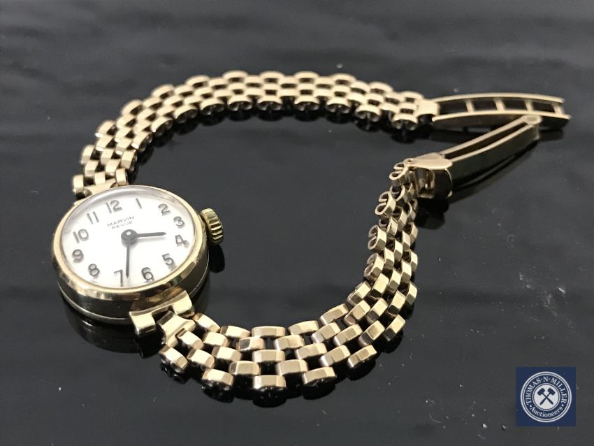 A 9ct gold Marvin wristwatch on 9ct gold bracelet 13.6g