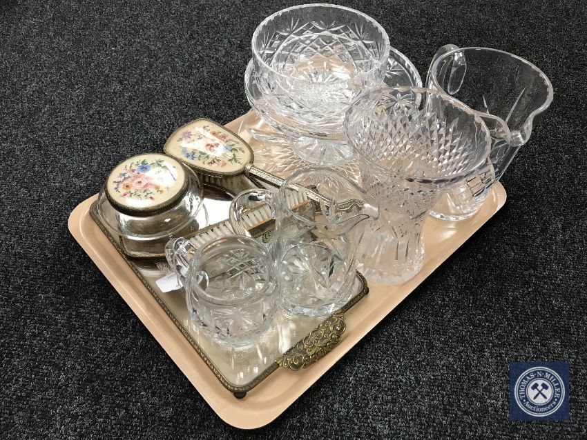 A tray of assorted glass ware, petit point dressing table set