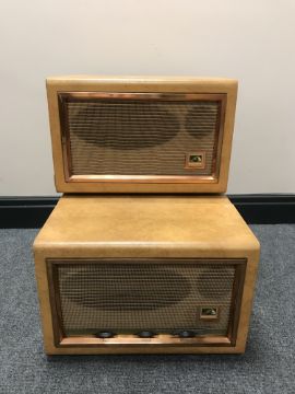 An HMV portable radiogram with Garrard turn table, model 209, together with marching portable speaker.