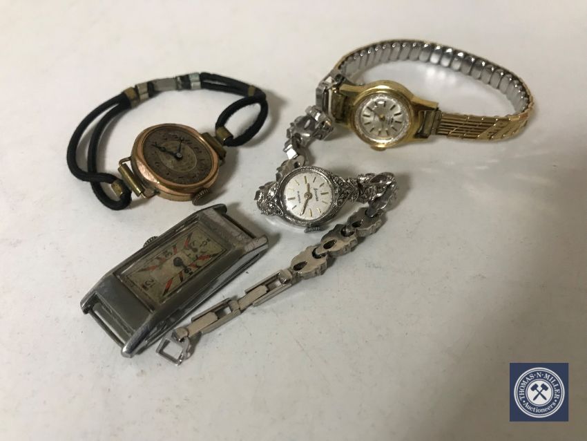 A box of four vintage watches, lady's gold wrist watch, Art Deco watch etc
