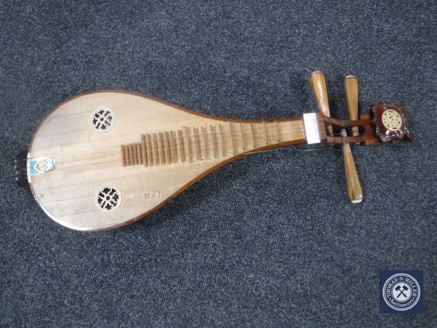 The instrument is missing a peg for one of its strings. It is 68cm long overall.