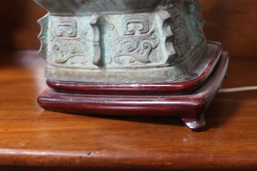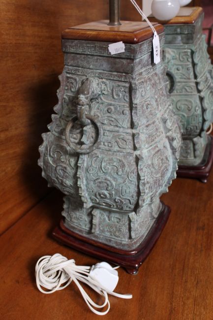 A pair of bronzed oriental style rise and fall table lamps (one stand missing a foot)