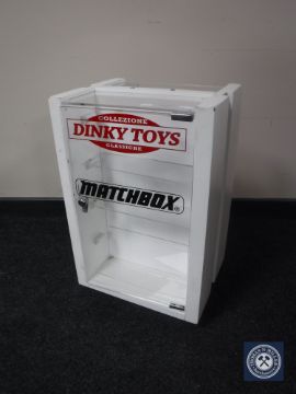 A revolving counter top display cabinet bearing "Dinky Toys and Matchbox"