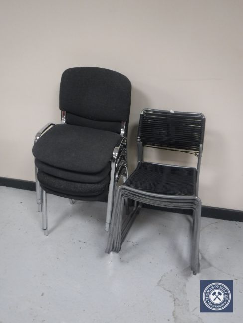 Four metal framed stacking chairs and another five metal framed stacking chairs