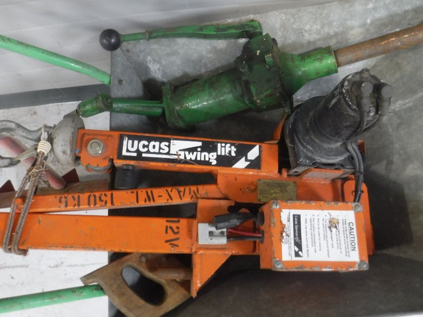A wheel barrow containing Lucas swing lift, pump, and a snow shovel