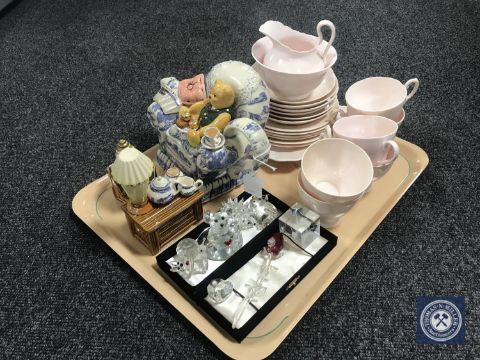 A tray containing a pink Tuscan china tea service, Ringtons novelty teapot, glass figures including Swarovski hedgehog