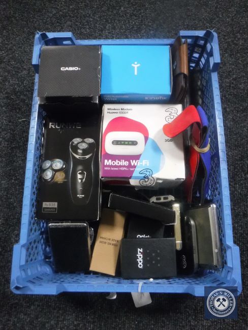A basket of Zippo lighters, dart cases, leather wallet, BP monitor etc
