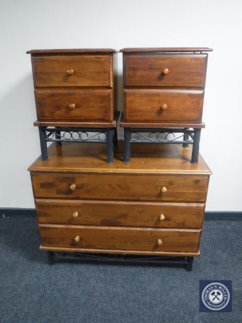 A contemporary pine and metal three drawer chest and a pair of matching bedside chests