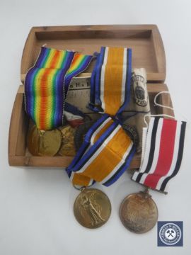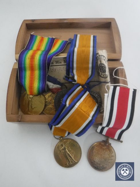 A box containing First World War Pair, named to 6428 Pte. H. S. Chandler. Leic. R., comprising British War Medal and Victory medal, together with another pair named to 201967 Pte. T. Pulling. Linc. R., comprising Victory Medal and Special Constabulary Medal, together with a Nottinghamshire County Council Medal and another medal. (6)