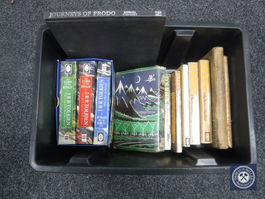 A box of books by JRR Tolkein, two auto car hand book and Lambretta scooter maintenance repair book
