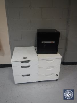 A metal safe with keys and two three-drawer desk chests