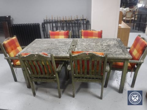 An Australian Plantation teak garden table, six armchairs and seat cushions