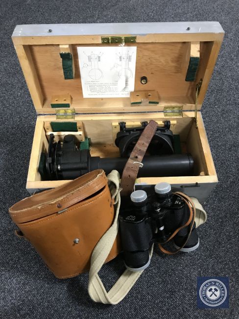 A military scope in fitted pine box together with a set of leather cased binoculars