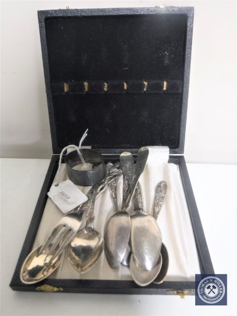 A box of silver napkin ring, set of five continental silver teaspoons, silver fork and three Britannia silver teaspoons