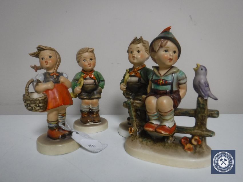 Four Hummel figures; Two boys with trumpets, girl with basket and Wayside Harmony