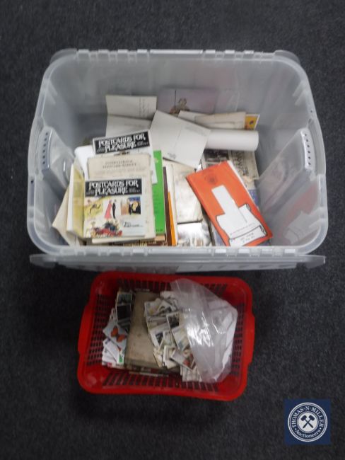 A box of cigarette cards, post cards, books relating to postcards etc