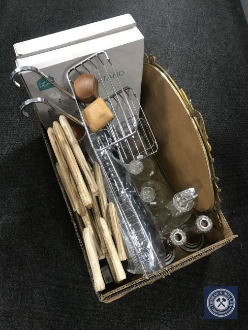 A box of glass decanters, candlesticks, gilt framed mirrors, boxed pan stands etc