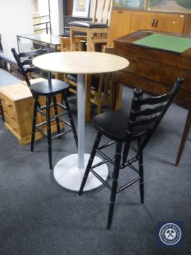 A pine topped metal based poser bar table and two bar chairs