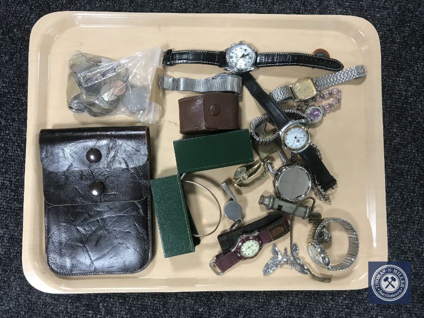 A tray of assorted wristwatches, whistles, coins, leather pouch, costume jewellery etc.