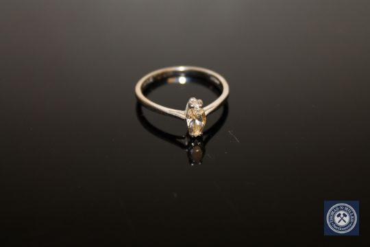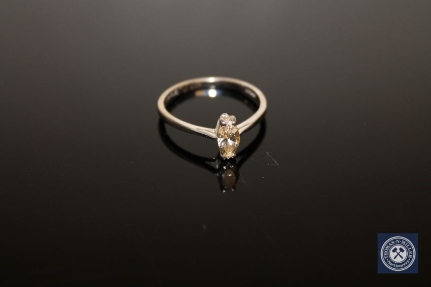 An 18ct white gold diamond solitaire ring, a marquise-cut diamond within a claw setting weighing approximately 0.41 carat, to knife edge shoulders and a plain shank, size M