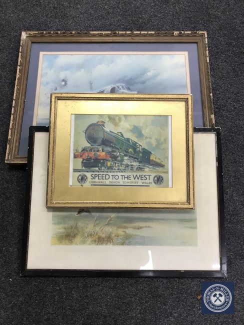 A framed Roger Green print of a hurricane, an antiquarian print and a GWR Speed to the West print