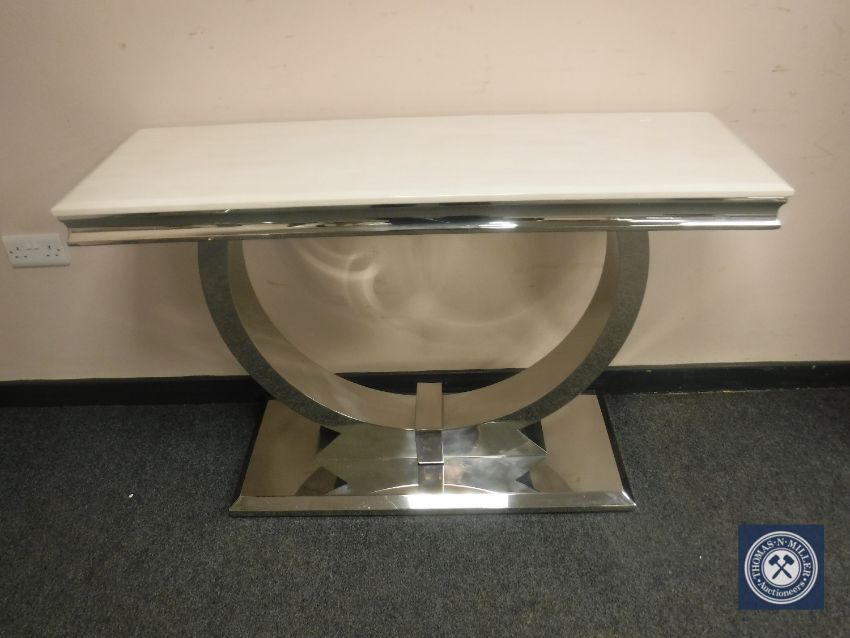 A contemporary polished steel console table with white polished stone top, width 122 cm