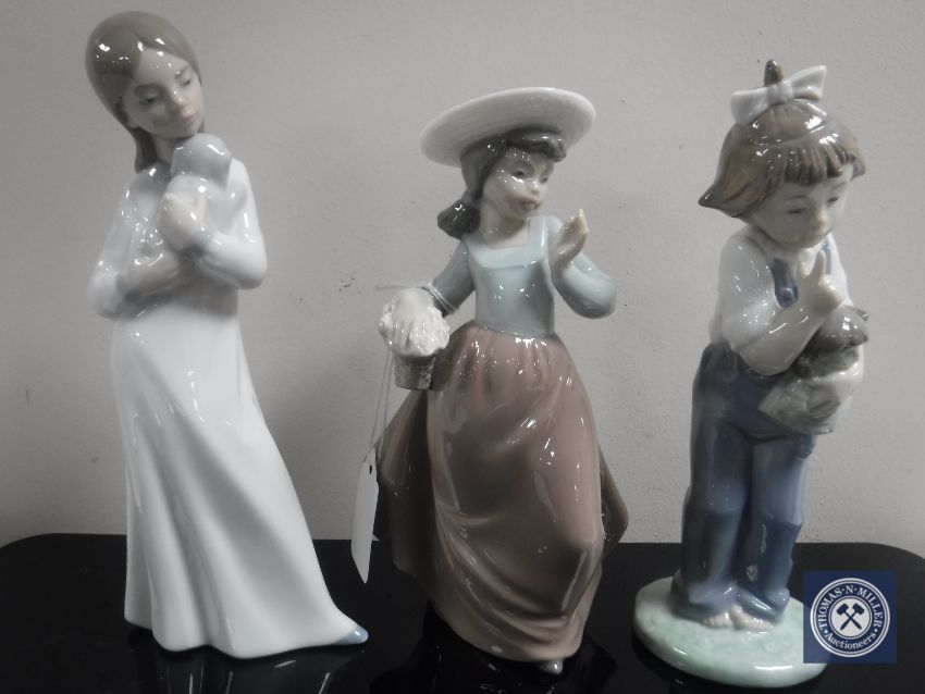 Three Nao figurines ; girl with puppy, girl with doll and basket of flowers. (3)