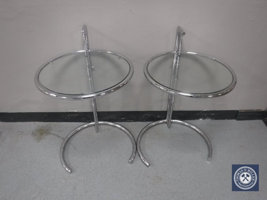 A pair of circular adjustable metal lamp tables