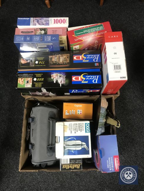 Two boxes of assorted electricals, video camera, jigsaws and two foot spa