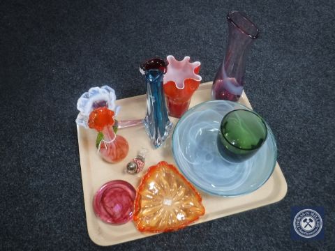 A tray of assorted glass ware, Caithness glass vase, flower bowl, bird paperweight etc