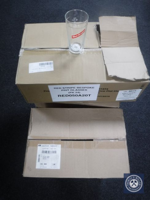 Seven boxes of unused pint glasses.