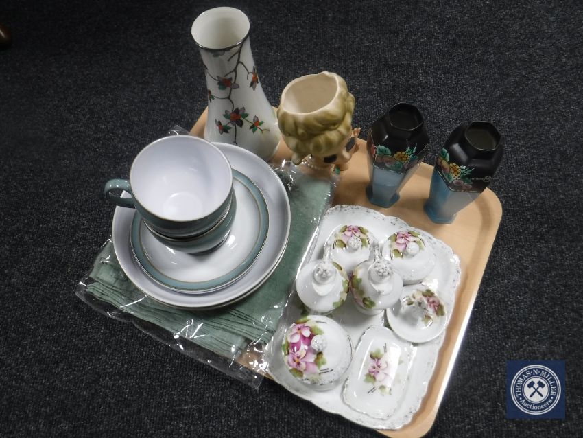 A tray containing pair of Shelley hexagonal vases, Denby stoneware mugs and plates, floral porcelain dressing table set