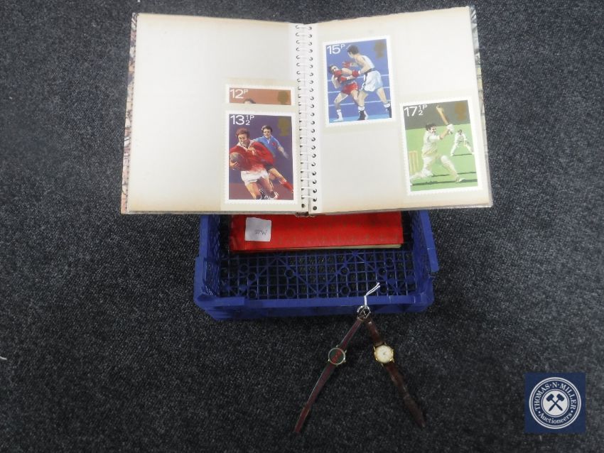 A crate containing two albums of first day covers together with two wristwatches