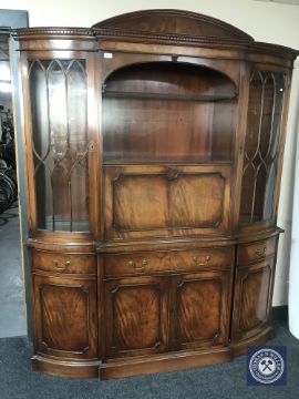 A reproduction mahogany bowfronted cocktail display cabinet fitted cupboards and drawers beneath