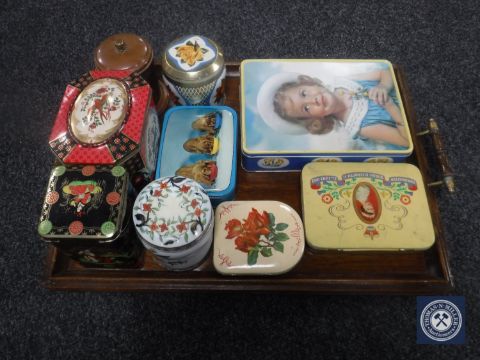 An oak twin-handled serving tray, eight vintage tins and a tea caddy