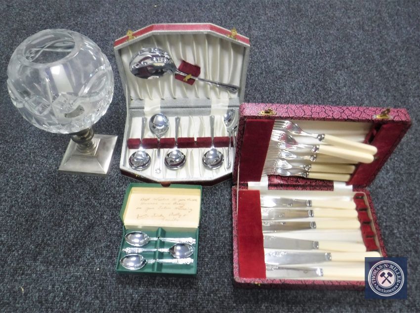 Three boxes of cutlery together with a glass and silver plated candle holder