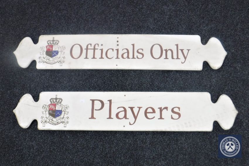 Two hand-painted British Hockey Federation signs, Officials Only and Players