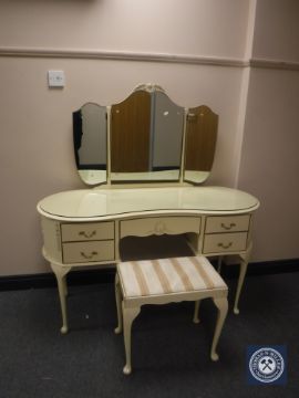 A cream and gilt kidney shaped dressing table with mirror and stool
