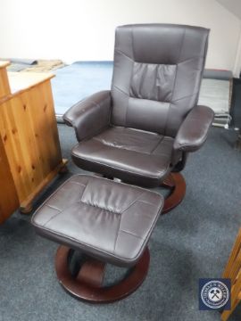 A brown leather electric swivel armchair with stool