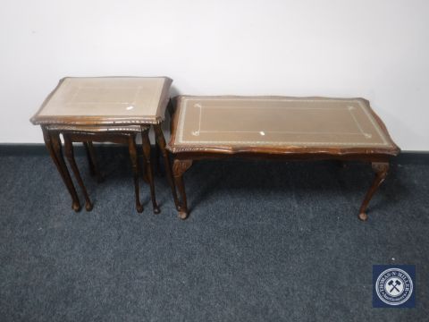 A mahogany glass and leather-topped coffee table together with matching nest of three tables