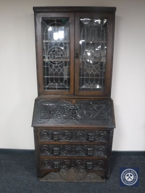 A Victorian carved oak Green Man bureau bookcase with leaded glass doors