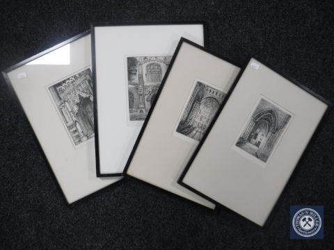 Four framed Anne Noble black and white etchings, church interiors and exteriors