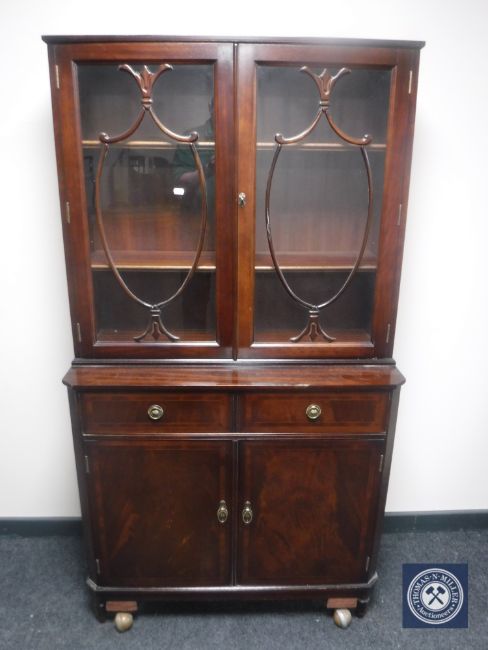 An inlaid glazed door bookcase with cupboards and drawers beneath