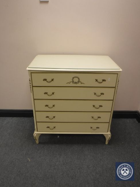 A cream and gilt glass topped five drawer chest and pair of matching bedside stands
