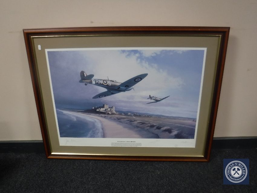 A mahogany framed signed limited edition print, Enniskillen over Bamburgh, by Mark Postlewaite, signed by Squadron Leader Desmond Sheen, number 614/850