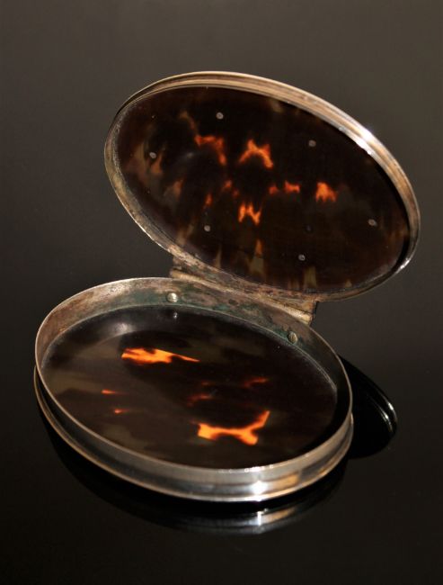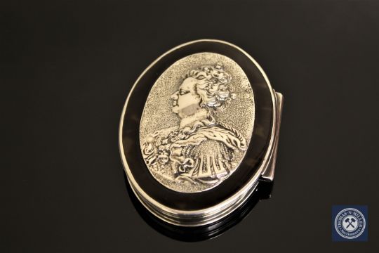 A white metal and tortoiseshell pill box with a relief portrait of Queen Anne