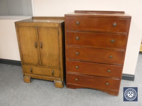 A mid 20th century oak linen cupboard and a five-drawer chest