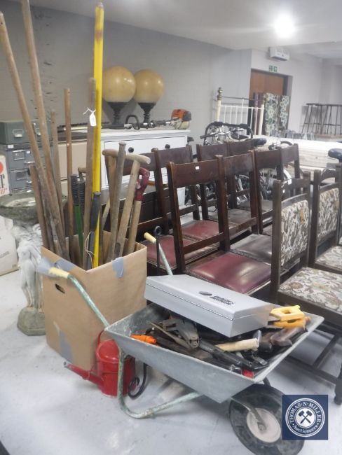 A wheel barrow containing hand tools, garden tools, drill, further box of watering can and garden tools
