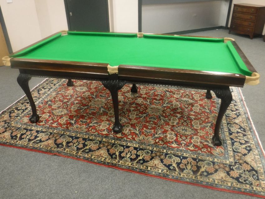 A good quality mahogany slate-bed snooker-dining table, with two-section top, length 230cm, width 128cm, together with a set of eight matching dining chairs in beige fabric, with accessories to include set of snooker balls, set of pool balls, nine cues and a rest.