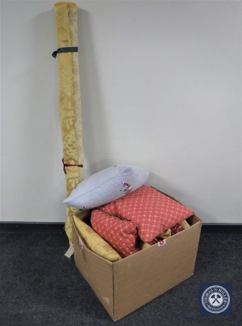 A box containing a roll of gold-coloured fabric together with nine assorted cushions